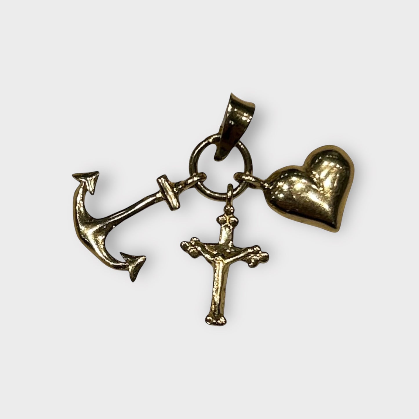 This special pendant made of 14k gold consists of a central pendant to which three other meaningful pendants are attached. The set includes a cross that stands for faith, a heart that symbolizes love, and a ship's anchor that represents hope and perseverance. The combination of these symbols makes the pendant a powerful piece of jewelry that carries both spiritual and emotional meaning. Ideal for anyone who wants to combine their values of faith, love and hope in a stylish and symbolic accessory.